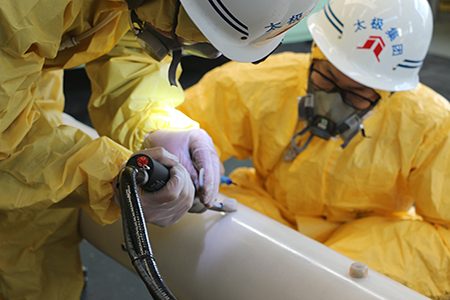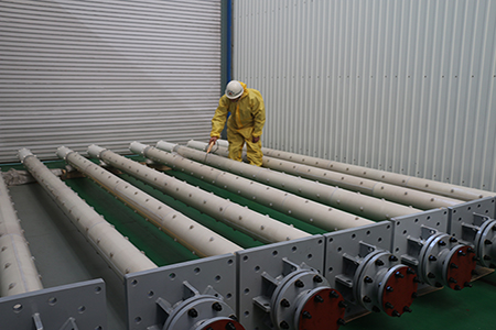 The special feeding pipe for Chloromethane reactor produced by our company is our patent product. Its characteristic is that the lining layer is made of PFA material formed by a special process, the inner tube by expanded, the outer tube by glued and fixed with a fixed pin, and all flange interfaces are integrally molded. Due to the same lining PFA material, all welding seams are completely integrated into one. The danger of cracking and leakage of the weld under the conditions of high temperature and high air flow vibration is avoided. The PFA feeding tube can be operated at a high temperature of 200 °C for a long time, and has the characteristics of strong corrosion resistance and strong penetration resistance.