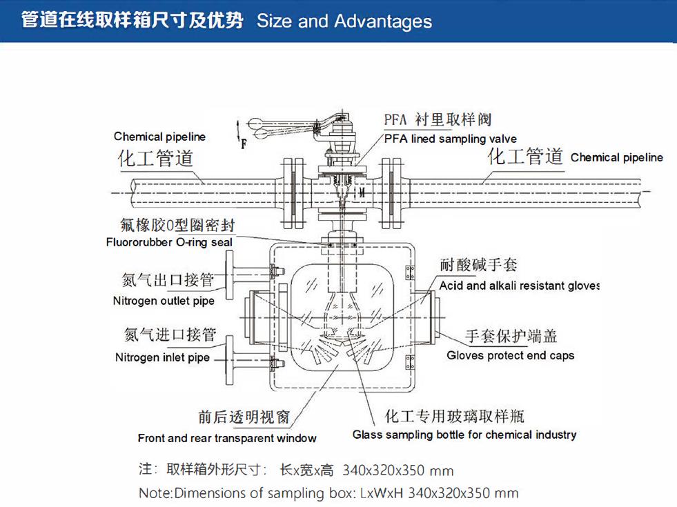 PFA襯里不銹鋼取樣閥采用密封連接形式設(shè)置于四氟手套箱上方,四氟手套箱體在操作方位設(shè)有可快速開關(guān)閉視窗門,后方設(shè)有氮?dú)膺M(jìn)出口,連接氮?dú)鈿庠春筮M(jìn)行箱體內(nèi)部及取樣瓶內(nèi)空間清掃,安裝瓶體穩(wěn)妥后小心按壓頂部操作手柄,使物料溫和而有控制地流入取樣瓶內(nèi)。當(dāng)獲得足夠的樣品時(shí),松開頂部按壓操作手柄,以確定安全停止了取樣過程。通過耐酸堿橡膠手套將取樣瓶從閥體上安全取下,并裝好取樣瓶蓋,可進(jìn)行再次氮?dú)饪臻g清掃,以進(jìn)—步保護(hù)操作人員,最終從四氟手套箱內(nèi)取出取樣瓶完成工藝取樣工作。